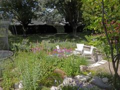 Er zijn dan ook enkele struiken/bomen in de tuin gezet om dit te benaderen. Samen met veel kleur en verschillende soorten planten is het een levende tuin geworden.