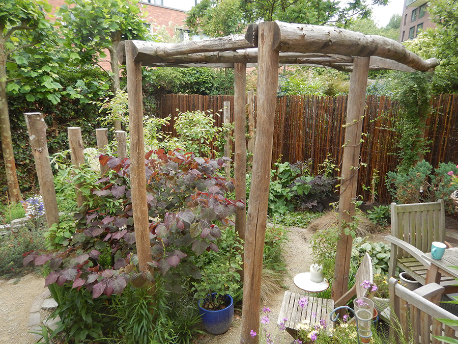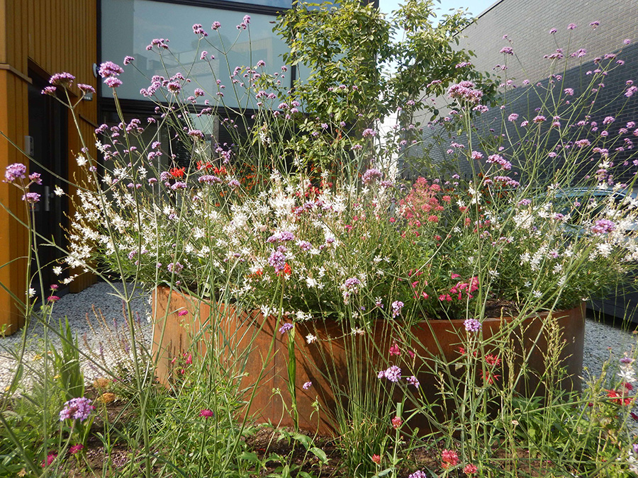 Duurzaamheid worden geïntegreerd door het gebruik van regenwateropvangsystemen voor het bewateren van planten, het kiezen van planten die weinig water nodig hebben of bijvoorbeeld gebruik van gerecyclede materialen voor de bestrating. Biodiversiteit kan worden verhoogd door het plaatsen van nestgelegenheid voor insecten (bijvoorbeeld een insectenhotel) en het planten van bloemen die vlinders en bijen voedsel bieden.